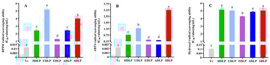 Antioxidant activities of polysaccharides from Dendrobium officinale leaves extracted using different methods. (A) DPPH radical scavenging ability; (B) ABTS radical scavenging ability; (C) Hydroxyl radical scavenging ability. Different letters indicate the significance at p < 0.05. ANOVA and Duncan’s test were used to assess significant differences among the different groups.