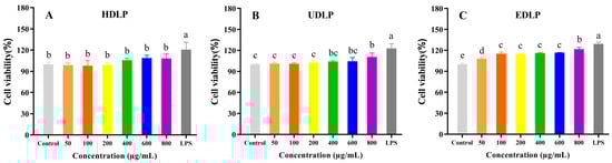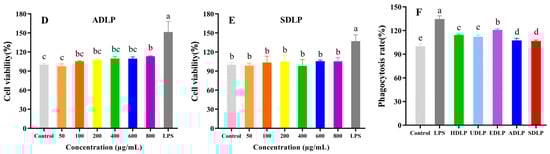 Macrophages play a crucial role in the immune response, and RAW264.7 macrophages are frequently utilized for in vitro studies of immune activity [44]. The effects of DLPs extracted by different methods on the proliferation of RAW264.7 cells were compared, with the results presented in Figure 7. Compared to the control group, cell viability in the DLP treatment groups increased to varying degrees at the tested concentrations (50–800 μg/mL), indicating that DLPs exhibit no cytotoxicity and have the potential to enhance the proliferation of RAW264.7 macrophages. However, the proliferation-enhancing effects of HDLP (Figure 7A) and SDLP (Figure 7E) were insignificant (p > 0.05) at the tested concentrations. In contrast, the proliferation-enhancing effects of EDLP were significant (p < 0.05) at all the tested concentrations (Figure 7C), while the effects of UDLP (Figure 7B) and ADLP (Figure 7D) were significant (p < 0.05) only at the high concentration of 800 μg/mL. Phagocytosis by macrophages is essential for non-specific immunity against the invasion of foreign materials [45]. Increased phagocytosis is a key indicator of macrophage activation and represents one of the primary defense mechanisms employed by these immune cells. As shown in Figure 7F, all five DLPs significantly increased the phagocytic activity of RAW264.7 cells (p < 0.05). Among these, EDLP demonstrated the strongest effect, boosting the phagocytosis of RAW264.7 cells by 20.79%, followed by HDLP (14.33%) and UDLP (12.10%).