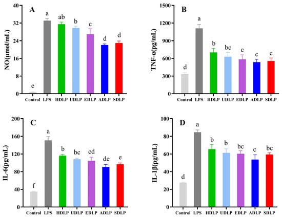 NO is an important gaseous signaling molecule that is integral to both physiological and pathological processes, particularly in inflammatory responses. TNF-α serves as a pivotal inflammatory mediator that plays a critical role in immune regulation by influencing the secretion of other inflammatory factors, activating T cells, and stimulating phagocytosis. IL-1β and IL-6 are potent pro-inflammatory cytokines that can stimulate the production of various other pro-inflammatory mediators [16]. Collectively, these factors are essential in modulating the immune response and enhancing the body’s defense against infections and injuries. Polysaccharides, as active substances, have the ability to stimulate macrophages to secrete NO, TNF-α, IL-6, and IL-1β, thereby bolstering the body’s resistance to external pathogens [46]. As demonstrated in Figure 8, all polysaccharide samples significantly promoted the release of NO and the secretion of TNF-α, IL-6, and IL-1β in RAW264.7 cells when compared to the control group (p < 0.05), although their effects were lower than those in the LPS treatment group. In terms of NO release, the stimulatory effects of HDLP, UDLP, and EDLP were significantly higher than those of SDLP and ADLP (p < 0.05), with the HDLP group achieving the highest level of 31.01 µmol/L, comparable to the LPS group (Figure 8A). For TNF-α (Figure 8B) and IL-6 (Figure 8C) secretion, the effects of HDLP and UDLP were significantly greater than those of EDLP, SDLP, and ADLP (p < 0.05), with no significant difference between UDLP and EDLP. Regarding IL-1β secretion, the effects of HDLP, UDLP, EDLP, and SDLP were significantly (p < 0.05) greater than that of ADLP (Figure 8D). Overall, the enhancing effects on NO release and the secretion of TNF-α, IL-6, and IL-1β in RAW264.7 cells were ranked in the following order: HDLP > UDLP > EDLP > SDLP > ADLP.