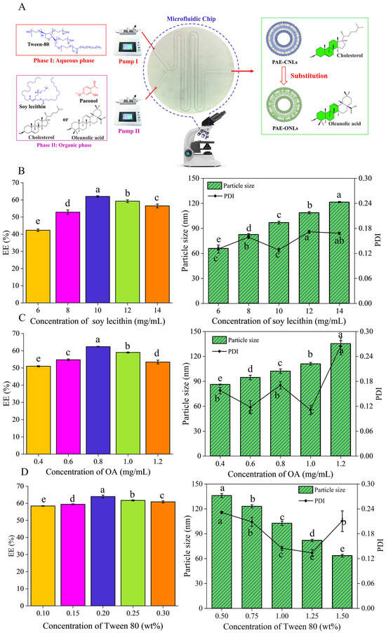 Microfluidic preparation of PAE-ONLs and optimization of preparation parameters through single-factor experiments. (A) Schematic diagram showing the microfluidic chip design and liposome formation process. Effects of (B) soy lecithin concentration (mg/mL), (C) oleanolic acid concentration (mg/mL), and (D) Tween 80 concentration (wt%) on the EE, particle size, and PDI. The various letters indicate significant differences (p < 0.05) across samples, and the data show mean ± standard deviation (n = 3).