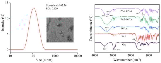 Characterization of PAE-ONLs. Particle size distribution curve with TEM image. FTIR spectra of OA, PAE, ONLs, PAE-ONLs, and PAE-CNLs.