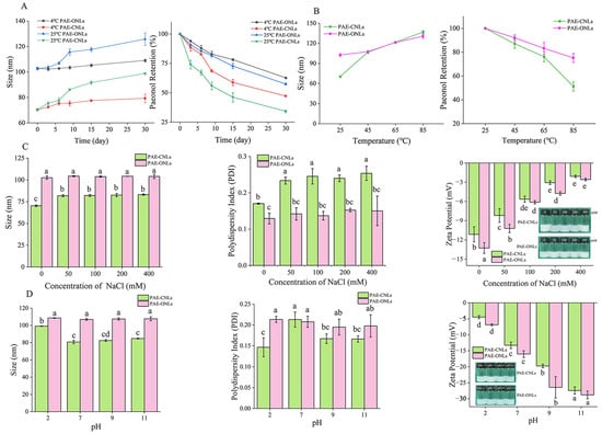 Stability studies of PAE-ONLs and PAE-CNLs. (A) Effect of storage time and temperature on particle size and paeonol retention. (B) Effect of temperature on particle size and paeonol retention. (C) Effect of ionic strength on particle size, polydispersity index, zeta potential, and appearance. (D) Effect of pH on particle size, PDI, zeta potential, and appearance. Data are presented as mean ± standard deviation (n = 3), with different letters indicating significant differences (p < 0.05) across samples.