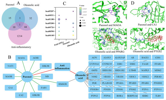 Network pharmacology analysis of anti-inflammatory targets and pathways of paeonol, oleanolic acid, and PAE-ONLs. (A) Venn diagram of anti-inflammatory targets. (B) Compound–Target–Disease network. (C) KEGG pathway enrichment analysis. (D) Molecular docking results.