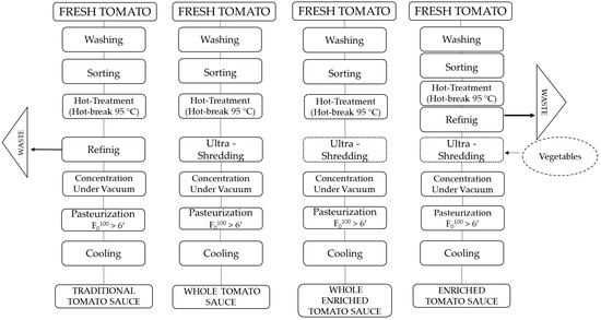 Production process of the traditional tomato sauce (TS), traditional enriched tomato sauce (ETS), whole tomato sauce (WTS), and whole enriched tomato sauce (WETS).
