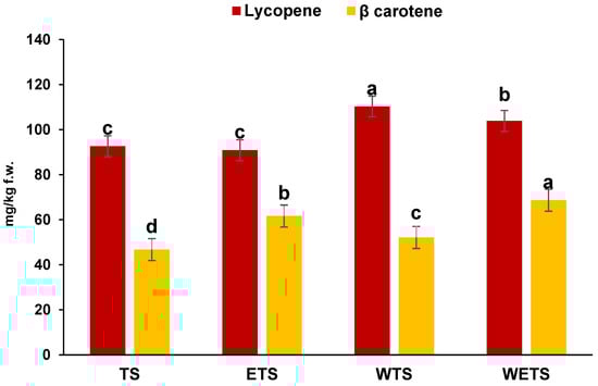 Lycopene and β-carotene content (mg/kg f.w.) of traditional tomato sauce (TS), Traditional Enriched tomato sauce (ETS), Whole tomato sauce (WTS) and Whole Enriched tomato sauce (WETS). a–d Different letters in the same column indicate significant difference (p < 0.05). Data represent the mean ± standard deviation of three replications (n = 3).