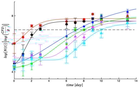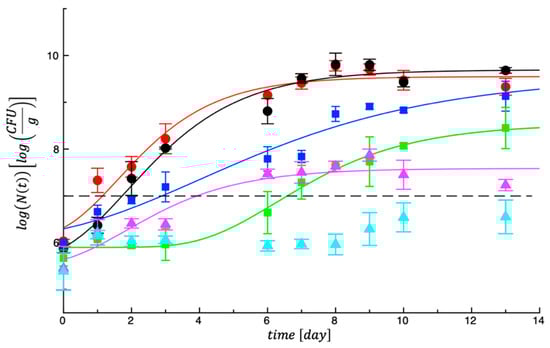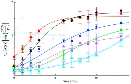 As regards the evolution of spoilage microorganisms, Figure 1 reports a trend of the experimental data of mesophilic bacteria recorded in our samples. As can be observed in the figure, total mesophilic counts in the two control samples grew rapidly and overlapped the microbial threshold within the first 3 days of storage. On the other hand, in the same figure it can be observed that the other four treated samples recorded a different microbial evolution, with growth rate more delayed and lag phase more prolonged, if compared with those of the control meat. To better highlight differences among samples, a fitting procedure was adopted, and the MAL value was calculated for each specific microbial specie, as main fitting parameter.