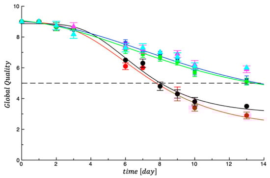 According to other literature references in which the shelf life of fresh meat was calculated on the basis of microbiological and sensory quality evolution [29,30], the current work used a modified version of the Gompertz equation to calculate the microbiological acceptability limit (MAL) and the sensory acceptability limit (SAL), by fitting both microbiological and sensory experimental data. The lowest value among the calculated MAL and SAL values was identified as the product shelf life, being the time in days in which the product maintained an acceptable quality.