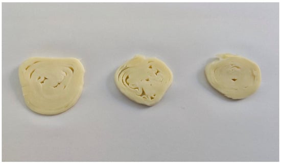 The total volume of milk used to make rolled cheeses was 10 L per treatment. The rolled cheese obtained using only cow’s milk served as the control, while the experimental rolled cheeses were produced with the addition of 10% and 20% donkey’s milk. Initially, the temperature of raw milk was heated to 40 °C. Powder rennet (0.3 g; Caglificio Clerici, Como, Italy), dissolved in a small amount of water, was then added to the milk. The milk was left to form curds for 60 min (100% cow’s milk), 260 min (90% cow’s milk and 10% donkey’s milk), and 310 min (80% cow’s milk and 20% donkey’s milk). The notably extended coagulation times observed in curds with increasing proportions of donkey’s milk are likely due to the compositional characteristics of donkey milk. The formed curd was cut into cubes (approximately 2 cm3) and left for another 40 min. The whey was gently removed, and the curd was additionally cut and mixed with the remaining whey. Once again, the curd was left for approximately 30 min until the whey became white. Using a cotton cloth, the remaining whey was drained, after which the curd was stretched in hot water at 80 °C using a wooden spoon. The hot curd was hand-molded into a thin (5 mm) sheet. The sheet was hand-salted and hand-folded to form a rectangular form, which was then rolled from the sides to form two rolls. The rolls of cheese were wrapped into cotton cloth and left to drain for 24 h at 4 °C. The rolled cheeses were removed from cotton cloth, wrapped into cling film, and stored at 4 °C without undergoing ripening. All analyses were performed within 24 h.