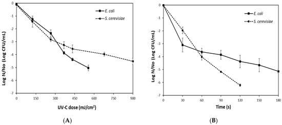 Comparing the effectiveness of UV-C on E. coli and S. cerevisiae, it was observed that the bacterium was significantly more sensitive to the treatment, exceeding five log reductions at 569 mJ/cm2 UV-C dose. However, a significant reduction of yeast was also achieved at a higher UV-C dose (900 mJ/cm2). These results agree with other studies regarding the stronger resistance to UV-C irradiation presented by S. cerevisiae and other yeasts compared to E. coli and other enterobacteria in fruit juices [,].