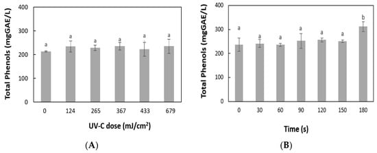 Total polyphenol concentration in grape juice during processing. (A) UV-C light treatment; (B) mild thermal treatment at 75 °C. Bars indicate standard deviation. Different letters indicate significant differences among treatment times (p < 0.05).