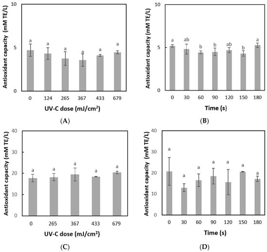Variation of antioxidant capacity over UV-C dose/processing time in grape juice: (A) UV-C treatment measured by ORAC; (B) mild thermal treatment at 75 °C measured by ORAC; (C) UV-C treatment measured by DPPH; (D) mild thermal processing at 75 °C measured by DPPH. Different letters indicate significant differences among treatment times/UV-C dose (p < 0.05). Bars indicate standard deviation.