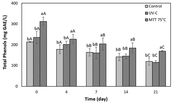 Evolution of the total phenols content of grape juice processed by UV-C or mild thermal treatment (MTT) during storage at 4 °C for 21 days. Different lowercase letters represent statistically significant differences between treatments (p < 0.05). Different uppercase letters indicate statistically significant differences between storage times (p < 0.05). Bars in the graph indicate standard deviation.