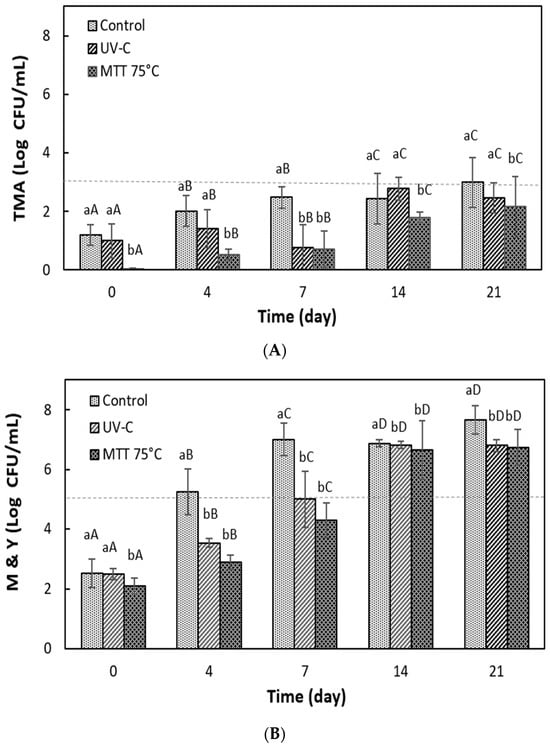 Evolution of the native microbiota of grape juice processed by UV-C or mild thermal treatment (MTT) during storage at 4 °C for 21 days. (A) Total mesophilic aerobes (TMA); (B) molds and yeasts (M and Y). Different lowercase letters represent statistically significant differences between treatments (p < 0.05). Different uppercase letters indicate statistically significant differences between storage times (p < 0.05). Bars in the graph indicate standard deviation. (---) Acceptable limit.
