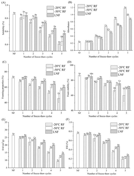 Effect of freezing methods on the solubility (A), turbidity (B), foaming properties (C), foam stability (D), emulsifying activity index (E) and emulsifying stability index (F) of crayfish myofibrillar protein. Distinct letters on the same column signify a significant difference (p < 0.05). Lowercase letters and uppercase letters represent statistical significance for the differences between freezing methods and freeze–thaw cycles, respectively. NF indicates non-frozen (