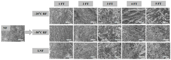 The results of the microstructural analysis are depicted in Figure 2. NF crayfish MP showed a smooth and compact surface. The degree of surface wrinkling progressively intensified with the increasing number of FT cycles, which was accompanied by a continuous enlargement of the surface pores. Compared to the −20 °C and −50 °C RF groups, the microstructure of LNF crayfish MP showed a more compact surface and smaller pores. This might have been the result of the formation of smaller ice crystals in the muscle tissue following LNF, which could reduce the damage to MP structure [35]. During the five FT cycles, the particle size, distribution, orientation, and shape of the ice crystals in crayfish muscle continuously changed, leading to protein aggregation, cross-linking, molecular rearrangement and the irreversible denaturation of MP. The recrystallization of ice crystals during the FT cycles could induce a mechanical force on MP, resulting in discontinuous tissue organization, structural loosening and the development of irregular surface pores. This mechanism aligns with observations in carp muscle, where FT cycles caused both intracellular and extracellular ice crystal formation, subsequently disrupting the native tissue microstructure [32]. Notably, LNF significantly mitigated the formation of internal surface pores and surface wrinkling compared to conventional RF.