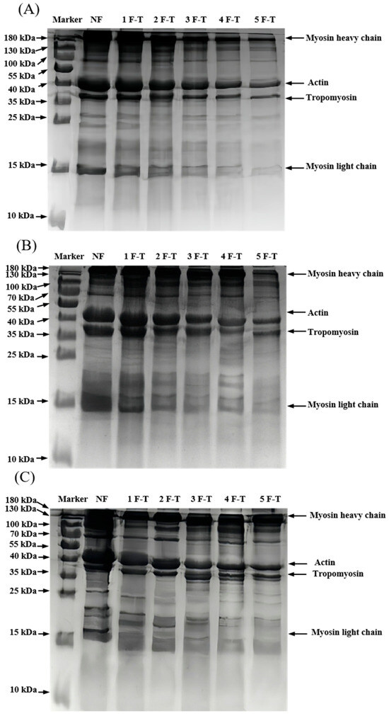 The FT cycles induce the degradation or aggregation of protein molecules, which is typically manifested as the disappearance or intensification of protein bands in SDS-PAGE [36]. MP contains myosin heavy chain, myosin light chain, actin, and tropomyosin [37]. The results of the molecular weight distribution analysis are shown in Figure 3. With prolonged frozen storage and an increasing number of FT cycles, the protein bands became progressively narrower and fainter. Similar studies on white shrimp demonstrated that progressive FT cycles promote the oxidation and degradation of MP [38]. Compared to LNF and −50 °C RF, MP treated at −20 °C RF exhibited the most attenuated band intensity throughout the FT cycles. Notably, the average molecular weight of LNF-treated MP retained the highest values, suggesting reduced degradation.