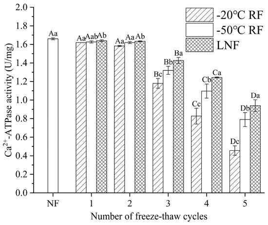Ca2+-ATPase activity of crayfish myofibrillar protein with different freezing methods. Distinct letters in the same column signify a significant difference (p < 0.05). Lowercase letters and uppercase letters represent statistically significant differences between freezing methods and freeze–thaw cycles, respectively. NF indicates non-frozen (