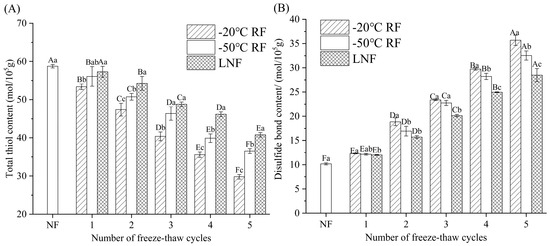 Total thiol (A) and disulfide bond (B) contents in crayfish myofibrillar protein under different freezing conditions. Distinct letters in the same column signify a significant difference (p < 0.05). Lowercase letters and uppercase letters represent statistically significant differences between freezing methods and freeze–thaw cycles, respectively. NF indicates non-frozen crayfish (