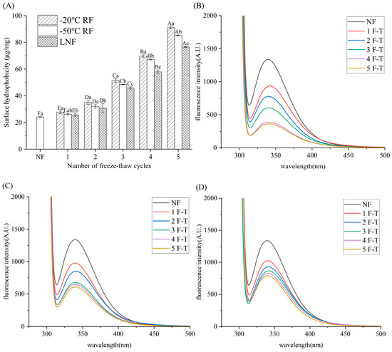 Surface hydrophobicity (A) and fluorescence intensity of crayfish myofibrillar protein frozen at −20 °C RF (B), −50 °C RF (C) and LNF (D). Distinct letters in the same column signify a significant difference (p < 0.05). Lowercase letters and uppercase letters represent statistically significant differences between freezing methods and freeze–thaw cycles, respectively. NF indicates non-frozen crayfish (