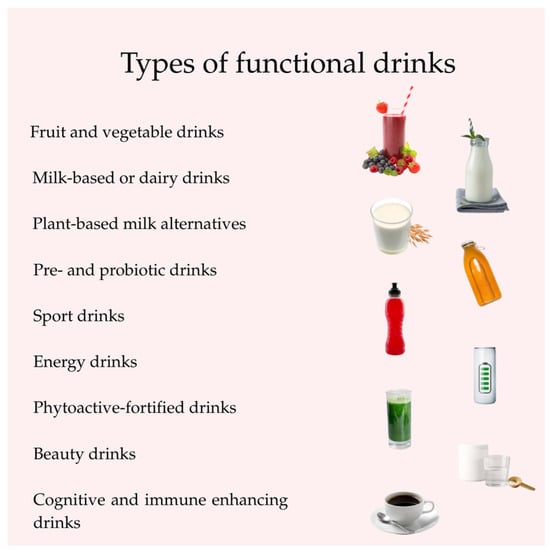 A large group of “functional foods” are “functional drinks” or “functional beverages”, whose market is expected to grow by 7.5% by the end of 2024, justifying the increased demand [3,7]. This is presumably due to innovations in dietetics and nutrition research in recent years. A functional beverage is defined as “any non-alcoholic beverage that provides additional health benefits through the incorporation of a bioactive component derived from plant, animal, marine or microorganisms” [3,8]. The concept of “functional beverages” or “functional drinks” differs from that of functional foods because it is basically a liquid that hydrates the body while also having other specific health benefits as well [3].