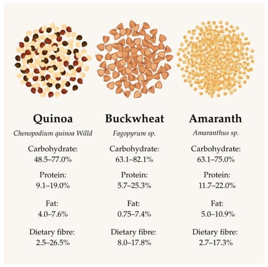 Although plant-based diets have many health benefits, they do not always reach the nutritional quality of animal products (e.g., dairy, eggs, meat, fish, etc.) in terms of protein quality [11]. Thus, the consumption of pseudocereals gains importance due to their protein content, combined with their positive health effects and biologically active compounds [12]. In general, compared to cereals, pseudocereals are lower in carbohydrates, but higher in protein, fat, and fiber [10]. Since pseudocereals are not botanically related to cereals, they have a different amino acid composition [11]. They have a well-balanced amino acid profile, being high in methionine, cysteine, and lysine. In addition, they are rich in bioactive compounds, such as unsaturated fatty acids, dietary fibers, flavonoids, lignans, antioxidant compounds, polyphenols, phytosterols, vitamins, and minerals [11].