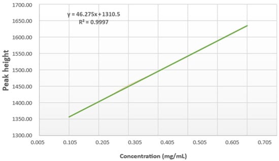 where x represents the concentration of methyl oleate (mg/mL), and y represents the peak height. The peak height exhibited a linear relationship with the methyl oleate concentration within the range of 0.008–0.558 mg/mL.