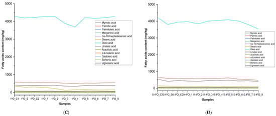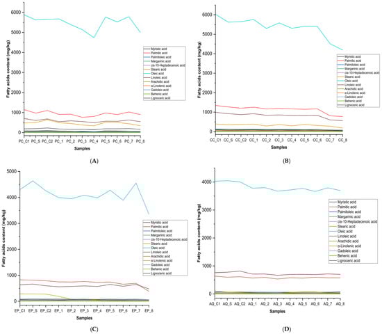 Fatty acid dynamics (mg/kg) under deep-frying conditions with HTyr supplementation in four extra virgin olive oil varieties: (A) Picual, (B) Cornicabra, (C) Empeltre, and (D) Arbequina. PC_C1: Picual_Control 1; PC_S: Picual_Supplemented; PC_C2: Picual_Control 2; PC_1: Picual_Exp 1; PC_2: Picual_Exp 2; PC_3: Picual_Exp 3; PC_4: Picual_Exp 4; PC_5: Picual_Exp 5; PC_6: Picual_Exp 6; PC_7: Picual_Exp 7; PC_8: Picual_Exp 8; CC_C1: Cornicabra_Control 1; CC_S: Cornicabra_Supplemented; CC_C2: Cornicabra_Control 2; CC_1: Cornicabra_Exp 1; CC_2: Cornicabra_Exp 2; CC_3: Cornicabra_Exp 3; CC_4: Cornicabra_Exp 4; CC_5: Cornicabra_Exp 5; CC_6: Cornicabra_Exp 6; CC_7: Cornicabra_Exp 7; CC_8: Cornicabra_Exp 8; EP_C1: Empeltre_Control 1; EP_S: Empeltre_Supplemented; EP_C2: Empeltre_Control 2; EP_1: Empeltre_Exp 1; EP_2: Empeltre_Exp 2; EP_3: Empeltre_Exp 3; EP_4: Empeltre_Exp 4; EP_5: Empeltre_Exp 5; EP_6: Empeltre_Exp 6; EP_7: Empeltre_Exp 7; EP_8: Empeltre_Exp 8; AQ_C1: Arbequina_Control 1; AQ_S: Arbequina_Supplemented; AQ_C2: Arbequina_Control 2; AQ_1: Arbequina_Exp 1; AQ_2: Arbequina_Exp 2; AQ_3: Arbequina_Exp 3; AQ_4: Arbequina_Exp 4; AQ_5: Arbequina_Exp 5; AQ_6: Arbequina_Exp 6; AQ_7: Arbequina_Exp 7; AQ_8: Arbequina_Exp 8.