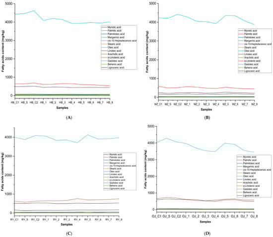 Fatty acid dynamics (mg/kg) under deep-frying conditions with HTyr supplementation in four extra virgin olive oil varieties: (A) Hojiblanca, (B) Manzanilla, and (C) Royuella, as well as (D) Pomace olive oil (Orujo). HB_C1: Hojiblanca_Control 1; Hojiblanca_Supplemented; Hojiblanca_Control 2; HB_1: Hojiblanca_Exp 1; HB_2: Hojiblanca_Exp 2; HB_3: Hojiblanca_Exp 3; HB_4: Hojiblanca_Exp 4; HB_5: Hojiblanca_Exp 5; HB_6: Hojiblanca_Exp 6; HB_7: Hojiblanca_Exp 7; HB_8: Hojiblanca_Exp 8; MZ_C1: Manzanilla_Control 1; MZ_S: Manzanilla_Supplemented; MZ_C2: Manzanilla_Control 2; MZ_1: Manzanilla_Exp 1; MZ_2: Manzanilla_Exp 2; MZ_3: Manzanilla_Exp 3; MZ_4: Manzanilla_Exp 4; MZ_5: Manzanilla_Exp 5; MZ_6: Manzanilla_Exp 6; MZ_7: Manzanilla_Exp 7; MZ_8: Manzanilla_Exp 8; RY_C1: Royuela_Control 1; RY_S: Royuela_Supplemented; RY_C2: Royuela_Control 2; RY_1: Royuela_Exp 1; RY_2: Royuela_Exp 2; RY_3: Royuela_Exp 3; RY_4: Royuela_Exp 4; RY_5: Royuela_Exp 5; RY_6: Royuela_Exp 6; RY_7: Royuela_Exp 7; RY_8: Royuela_Exp 8; OJ_C1: Pomace_Control 1; OJ_S: Pomace_Supplemented; OJ_C2: Pomace_Control 2; OJ_1: Pomace_Exp 1; OJ_2: Pomace_Exp 2; OJ_3: Pomace_Exp 3; OJ_4: Pomace_Exp 4; OJ_5: Pomace_Exp 5; OJ_6: Pomace_Exp 6; OJ_7: Pomace_Exp 7; OJ_8: Pomace_Exp 8.