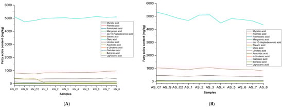 Fatty acid dynamics (mg/kg) during deep-frying with HTyr supplementation in various olive oils: (A) EVOO Koroneiki, (B) EVOO Arbosana, (C) olive oil 1°, and (D) olive oil 0.4°. KN_C1: Koroneiki_Control 1; KN_S: Koroneiki_Supplemented; KN_C2: Koroneiki_Control 2; KN_1: Koroneiki_Exp 1; KN_2: Koroneiki_Exp 2; KN_3: Koroneiki_Exp 3; KN_4: Koroneiki_Exp 4; KN_5: Koroneiki_Exp 5; KN_6: Koroneiki_Exp 6; KN_7: Koroneiki_Exp 7; KN_8: Koroneiki_Exp 8; AS_C1: Arbosana_Control 1; AS_S: Arbosana_Supplemented; AS_C2: Arbosana_Control 2; AS_1: Arbosana_Exp 1; AS_2: Arbosana_Exp 2; AS_3: Arbosana_Exp 3; AS_4: Arbosana_Exp 4; AS_5: Arbosana_Exp 5; AS_6: Arbosana_Exp 6; AS_7: Arbosana_Exp 7; AS_8: Arbosana_Exp 8; 1°O_C1: Olive 1°_Control 1; 1°O_S: Olive 1°_Supplemented; 1°O_C2: Olive 1°_Control 2; 1°O_1: Olive 1°_Exp 1; 1°O_2: Olive 1°_Exp 2; 1°O_3: Olive 1°_Exp 3; 1°O_4: Olive 1°_Exp 4; 1°O_5: Olive 1°_Exp 5; 1°O_6: Olive 1°_Exp 6; 1°O_7: Olive 1°_Exp 7; 1°O_8: Olive 1°_Exp 8; 0.4°O_C1: Olive 0.4°_Control 1; 0.4°O_S: Olive 0.4°_Supplemented; 0.4°O_C2: Olive 0.4°_Control 2; 0.4°O_1: Olive 0.4°_Exp 1; 0.4°O_2: Olive 0.4°_Exp 2; 0.4°O_3: Olive 0.4°_Exp 3; 0.4°O_4: Olive 0.4°_Exp 4; 0.4°O_5: Olive 0.4°_Exp 5; 0.4°O_6: Olive 0.4°_Exp 6; 0.4°O_7: Olive 0.4°_Exp 7; 0.4°O_8: Olive 0.4°_Exp 8.
