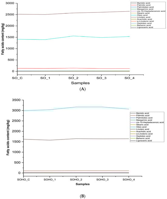 Fatty acid dynamics (mg/kg) during deep-frying at 170–210 °C for 3–6 h in various experiments using sunflower oils (A) and high-oleic-acid sunflower oils (B). Results are compared to the non-fried control samples (SO_C) and (SOHO_C). The figure illustrates the degradation or retention trends of major fatty acids under thermal conditions. SO_C: sunflower oil control; SO_1: sunflower oil deep-fried at 170 °C for 3 h; SO_2: sunflower oil deep-fried at 170 °C for 6 h; SO_3: sunflower oil deep-fried at 210 °C for 3 h; SO_4: sunflower oil deep-fried at 210 °C for 6 h; SOHO_C: high-oleic acid sunflower oil control; SOHO_1: high-oleic acid sunflower oil deep-fried at 170 °C for 3 h; SOHO_2: high-oleic acid sunflower oil deep-fried at 170°C for 6h; SOHO_3: high-oleic acid sunflower oil deep-fried at 210 °C for 3 h; SOHO_4: high-oleic acid sunflower oil deep-fried at 210 °C for 6 h.