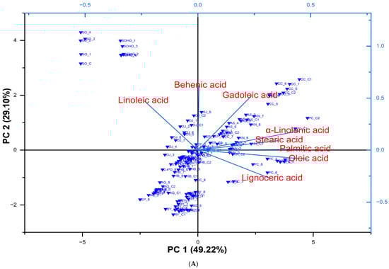 The clustering patterns shown in Figure 6 illustrate the distinct fatty acid compositions (mg/kg) characteristic of different oil types. Sunflower oils cluster prominently around linoleic acid, reflecting their high content of polyunsaturated fatty acids. In contrast, cultivars such as Picual, Empeltre, Manzanilla, Hojiblanca, and Royuella group closely with lignoceric acid, indicating a unique fatty acid profile likely influenced by their varietal traits and harvesting stages. As anticipated, most olive oils cluster near oleic acid and palmitic acid, the predominant fatty acids that contribute to their oxidative stability and nutritional benefits. These clear clustering trends demonstrate the effectiveness of fatty acid profiling combined with PCA in distinguishing oil types and evaluating their quality and stability during deep-frying.
