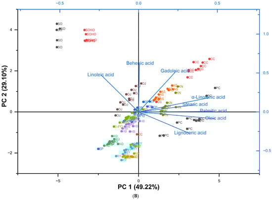 (A) Score and loading plots of various extra virgin olive oils (EVOOs), refined olive oils blended with EVOO or virgin olive oil (VOO) under HTyr supplementation, compared to sunflower oil and high-oleic sunflower oil. The plots illustrate the potential clustering of oil samples based on fatty acid changes (mg/kg) before and during deep-frying, as revealed by principal component analysis (PCA). (B) PCA clustering analysis based on different oil categories: the PCA clustering analysis categorizes different oils based on their fatty acids content (mg/kg), including myristic acid, palmitic acid, palmitoleic acid, margarinic acid, cis-10-heptadecenoic acid, stearic acid, oleic acid, linoleic acid, α-linolenic acid, arachidic acid, gadoleic acid, behenic acid, and lignoceric acid. (C) Cluster plot with confidence ellipse and PCA biplot showing the variables influencing the principal components of various categories of edible oils based on their fatty acid content. Refer to the captions of Table 6 for the abbreviations and meanings of the olive oil and sunflower oil samples.