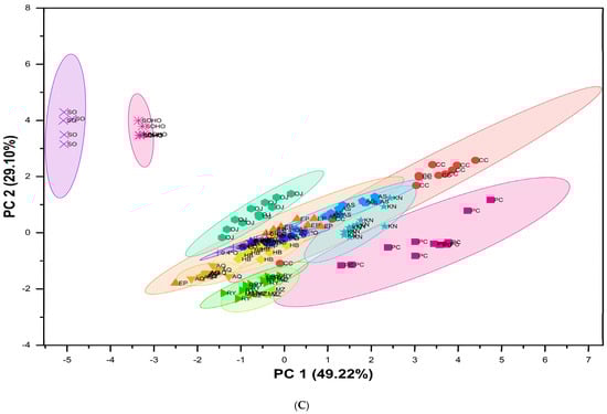 All analyses were performed in triplicate, and results are expressed as mean ± standard deviation (SD). Statistical significance was evaluated using one-way analysis of variance (ANOVA) in SPSS (version 28; IBM SPSS Statistics, Chicago, IL, USA), followed by Tukey’s post hoc test for multiple comparisons. Differences were considered statistically significant at p < 0.05. Additionally, principal component analysis (PCA), including scores and loadings (biplot), was conducted using OriginLab 2025 software (OriginLab Corporation, Northampton, MA, USA).