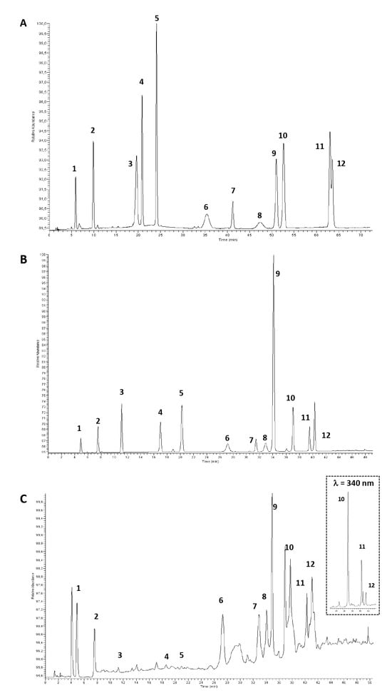 All the employed solvents (hexane, methanol, acetonitrile, formic acid) were of analytical grade and purchased from Sigma Aldrich (Milan, Italy). Analytical standards of apigenin, vanillic acid, ferulic acid, pcoumaric acid, veratric acid, and gallic acid were purchased from Merck Life Science (Milan, Italy), while 3-hydroxytyrosol, tyrosol, oleuropein, luteolin, kaempferol-3-O-glucoside, myricetin, and rutin were purchased from Extrasynthese (Genay, Lyon, France). Standards of oleacein, oleocanthal, and pinoresinol were purchased from PhytoLab (Vestenbergsgreuth, Germany). Folin–Ciocalteu reagent, 2,2′-azino-bis (3-ethylbenzothiazoline-6-sulphonic acid) diammonium salt (ABTS), (±)-6-hydroxy-2,5,7,8-tetramethylchromane-2-carboxylic acid (Trolox), 2,4,6-tris(2-pyridyl)-s-triazine (TPTZ), and 2,2-diphenyl-1-picrylhydrazyl (DPPH) were from Merck Life Science (Darmstadt, Germany). Water was purified using a Milli-Q Plus system from Millipore (Milford, MA, USA).