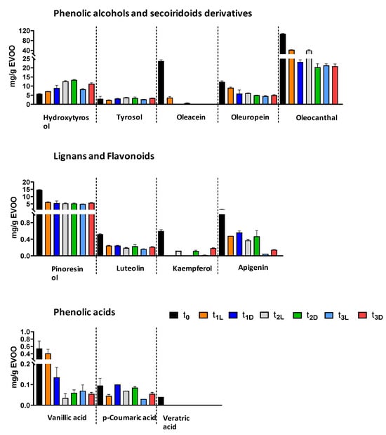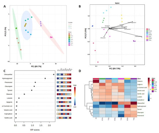 Figure 3D confirms the decrease in the concentrations in the majority of the phenolics during sample storage. Interestingly, oleocanthal emerged as the most relevant polyphenol among those identified in sample t