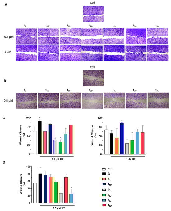 Figure 6C) with a % of wound closure of 88.8%, 81.4%, and 80.7%, respectively. When 1 µM of HT was used, only t