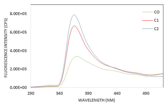 Excitation fluorescence spectra of control (C0) and aromatized oils (C1 and C2) for polyphenols acquired after excitation set at 270 nm.