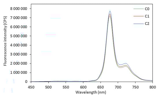 Excitation fluorescence spectra of control (C0) and aromatized oils (C1 and C2) for chlorophylls acquired after excitation set at 430 nm.