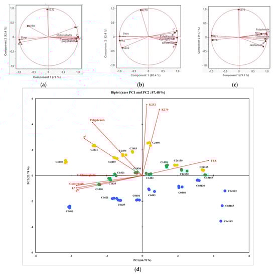 For the control EVOO non-aromatized with cloves (Figure 3a), the two principal components accounted for 90.4% of the variance, which means that the biplot was a good representation of the data’s structure. Component 1 (78%) is the dominant axis, capturing most of the variation; the variables strongly aligned with this axis contributed most to explaining the differences among samples. Polyphenols, carotenoids, chlorophylls, and colour parameters were positively correlated, whereas FFAs and storage duration were negatively correlated. Polyphenols and chlorophylls were negatively correlated with free fatty acids since they are situated in two opposite directions. Component 1 seems to also represent the oil quality, with the right side of the parameters showing good quality, whereas in the left we found the parameters of deterioration and oxidation of the oil (free fatty acids, K270). Component 2 may reflect early oxidation (K232) versus later or secondary effects (K270).