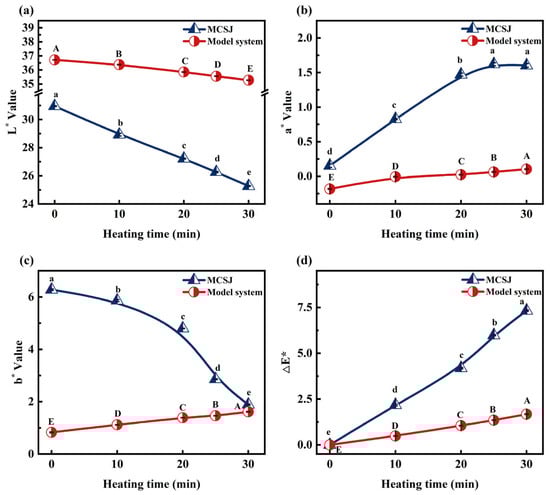 Colorimetric parameters of MCSJ and model system, (a) L*, (b) a*, (c) b*, and (d) ΔE*, during vacuum evaporation. Lowercase letters represent significant differences (p < 0.05) between samples with different heating times in the MCSJ system; uppercase letters represent significant differences (p < 0.05) between samples with different heating times in the model system.