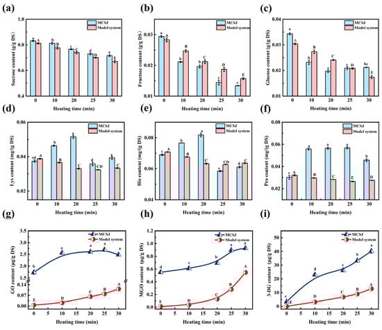 Changes in sugars in MCSJ and model system during vacuum evaporation ((a), sucrose; (b), fructose; (c) glucose; (d), Lys; (e), His; (f), Pro; (g), GO; (h), MGO; (i), 3-DG). Lowercase letters represent significant differences (p < 0.05) between samples with different heating times in the MCSJ system; uppercase letters represent significant differences (p < 0.05) between samples with different heating times in the model system.