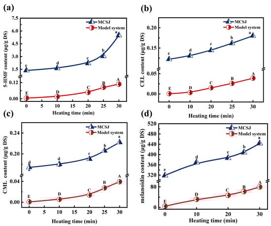 Changes in sugars in MCSJ and model system during vacuum evaporation ((a), 5-HMF; (b), CEL; (c), CML; (d), melanoidin). Lowercase letters represent significant differences (p < 0.05) between samples with different heating times in the MCSJ system; uppercase letters represent significant differences (p < 0.05) between samples with different heating times in the model system.
