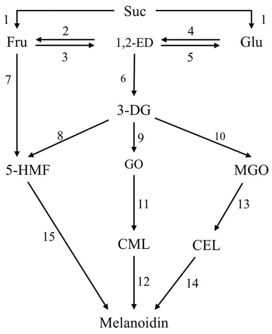 The α-dicarbonyl compounds (α-DCs), including GO, MGO, and 3-DG, serve as crucial reactive intermediates in Maillard reactions (MR), and they are the primary precursors for the formation of melanoidins in thermally processed foods. These compounds are also involved in the formation of Strecker aldehydes and the advanced stages of MR [41], and they are crucial factors contributing to the generation of carboxymethyl lysine (CML) [42].