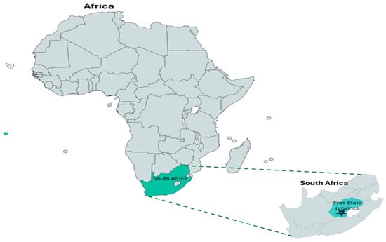 This study was conducted by procuring ninety samples of raw unpackaged spinach [Spinacia oleracea (L.)] and ninety samples of cabbage [Brassica oleracea var. capitata (L.)] heads from five farms, including sixty samples of raw unpackaged spinach phyllosphere and seventy-five samples of cabbage heads from five retail markets, respectively, in different local municipality districts within Free State Province, South Africa (Figure 1). The selected farms represent the major small-scale farms that supply the most leafy greens to various retailers. Spinach and cabbage were chosen due to their minimal processing production, demand, and purchase price. Leafy vegetables, like spinach, are available year round, while cabbage is available during winter, so each province in South Africa is unique in terms of suitable agricultural commodities that can be produced. Additionally, the Free State Agricultural Union reports that the province has 7.515 farming units, the highest in the country. Furthermore, it accounts for 26.4% of South Africa’s field crops and 15.9% of all its livestock. Moreover, Free State Province is responsible for 15% of South Africa’s gross agricultural income. The sector contributes approximately 7% to the provincial gross domestic product. Consumer demand puts pressure on the fresh leafy green vegetable industries for year-round supply. The farms selected are small-scale farms that supply retailers, small villages, street vendors, informal markets, and local supermarkets. Samples were collected in the following towns in Free State Province, South Africa: Motheo District, Mangaung Metropolitan (29.1217 S, 26.2128 E); Lejweleputwa District, Matjhabeng Local Municipality (28.9784 NS, 27.0264 E); Thabo Mofutsanyana District, Setsoto Municipality (28.9093 S, 27.5555 E]); Fezile Dabi District, Moqhaka Local Municipality (27.6373 S, 27.2323 E); and Thabo Mofutsanyana District, Dihlabeng Local Municipality (28.2423 S, 28.3111 E) [28].
