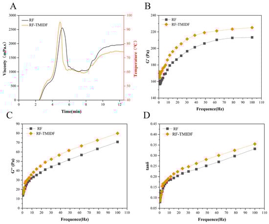 Notably, the BD increased from 1558.09 ± 58.50 mPa·s to 1807.28 ± 9.22 mPa·s (p < 0.05), demonstrating a decline in the thermomechanical stability of the RF-TMIDF gel. This elevation in BD may be due to the heterogeneous distribution of TMIDF within the starch network. Under high-temperature and shear conditions, the rigid structure of TMIDF could disrupt the continuity of the gel, leading to a breakdown of the gel network and a subsequent collapse in viscosity []. Overall, these findings suggest that TMIDF not only modifies the hydration and pasting behavior of starch but also contributes to a more complex and potentially tunable rheological profile, with implications for designing functional food matrices with improved processing and storage stability.
