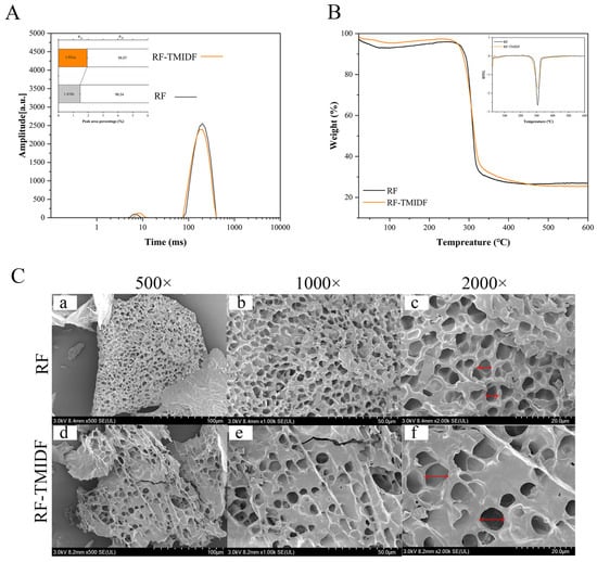 Physicochemical characterization of RF-TMIDF composites. (A) Low-field NMR relaxation time spectra of rice flour gels: T21, 8.0–13.0 ms (bound water); T2, 223.0–291.0 ms (free water); P21/P22, relative peak area proportions of T21 and T22; (B) thermogravimetric profiles (TGA/DTG) of gelatinized samples; (C) scanning elcectron micrographs of (a–c) RF and (d–f) RF-TMIDF at magnifications of 500×, 1000×, and 2000×, respectively. Arrows indicate characteristic pore structures.