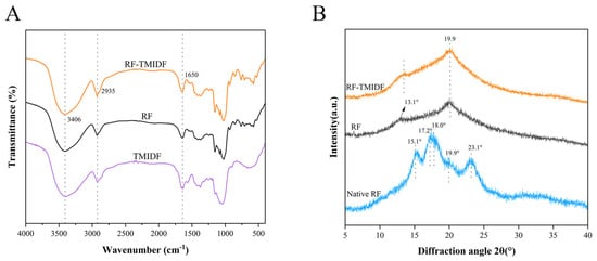 Structural characterization of RF, TMIDF, and their composite (RF-TMIDF). (A) FT-IR spectra; (B) XRD patterns of native RF and RF-TMIDF.