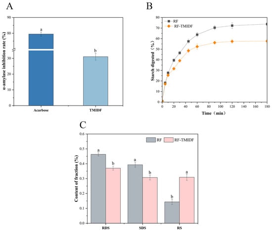 Effects of TMIDF on RF digestion. (A) Inhibition rates of α-amylase activity by TMIDF and acarbose (positive control); (B) digestive kinetics of RF and RF-TMIDF over time; (C) contents of RDS, SDS, and RS in RF and RF-TMIDF. W the same group, a and b indicate significant differences (p < 0.05).
