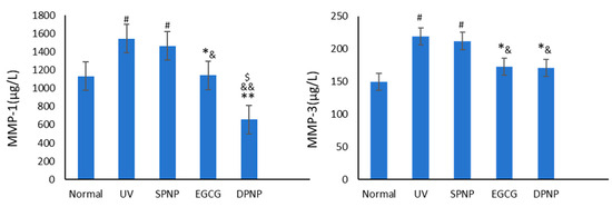 3.8. Effects of EGCG-NPs on Expression Level of MMPs in Skin