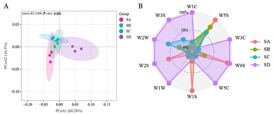 Electronic nose analysis of three grades of Wuyi Shuixian tea. (A) Principal Coordinates Analysis (PCoA) illustrating the differentiation between grades; (B) Radar chart depicting sensor responses (Normalize the data). SA: Grand Prize, SB: First Prize, SC: Outstanding Award, and SD: Non-award. W1C: Sensitive to aromatic compounds (benzenes), W5S: Sensitive to nitrogen oxides, W3C: Sensitive to ammonia water and aromatic components (amines), W6S: Selective for hydrogen (hydride), W5C: Sensitive to alkanes and aromatic components (short-chain alkanes), W1S: Sensitive to methane (methyl group), W1W: Sensitive to sulfides (inorganic sulfides), W2S: Sensitive to ethanol, W2W: Sensitive to organic sulfides, W3S: Sensitive to alkanes (long-chain alkanes).
